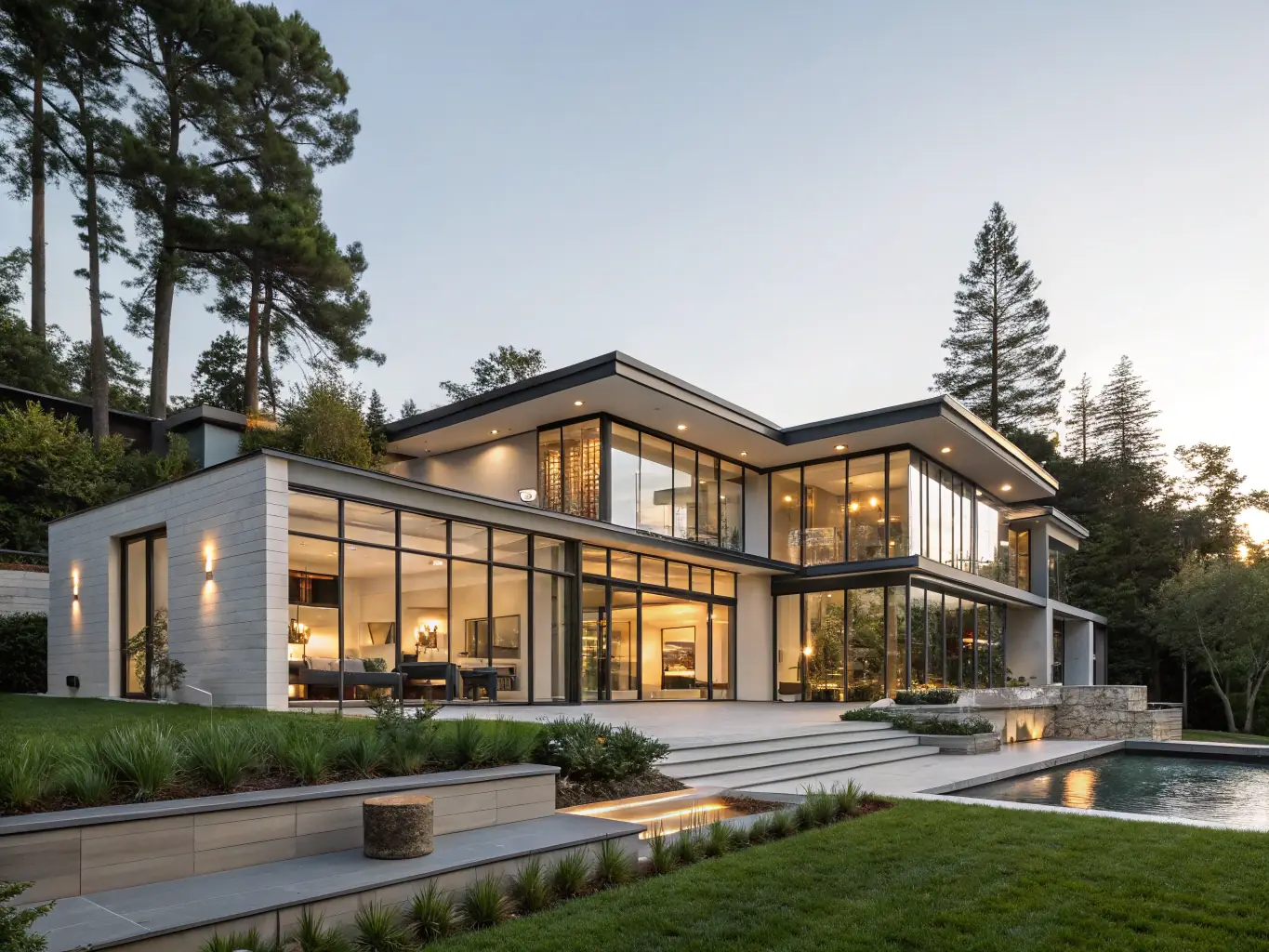 Nowoczesny dom z dużymi przeszkleniami i minimalistycznym wykończeniem, zaprojektowany z myślą o funkcjonalności i estetyce.